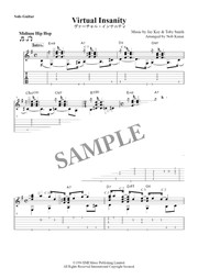 ジャミロクワイ(Jamiroquai)のヴァーチャル・インサニティのソロギター譜です。床が動くPVが印象的な曲ですね(某カップラーメンのCMでも使われました)。原曲どおり16分の3連、いわゆるHip Hopのノリにしてあります。雰囲気がつかみづらい場合は演奏動画参照していただければと思います。