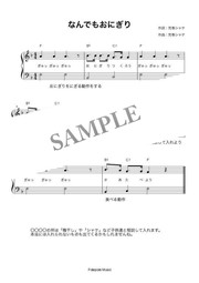 荒巻シャケ作詞/作曲 遊び歌「なんでもおにぎり」弾き歌い楽譜です。おにぎりの中に入れる物を変えて遊びます。遊び方メモ付き、コードネーム付き、PDF1ページです。
