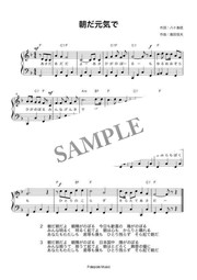 「朝だ元気で」弾き歌い楽譜です。ラジオ体操のオープニング曲に使われていた曲です。3番までの歌詞があります。コードネーム付き、PDF1ページです。
