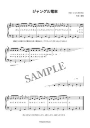 ともろぎゆきお作詞/峯陽作曲 遊び歌「ジャングル電車」弾き歌い楽譜です。2人乗り電車から始まり、いろんな動物を載せていきます。遊び方メモつき、PDF1ページです。
