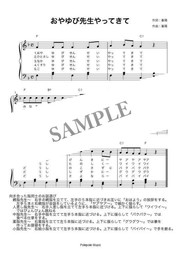 峯陽作詞/作曲 「おやゆび先生やってきて」弾き歌い楽譜です。ゆび遊び歌です。遊び方メモ、コードネーム付きPDF1ページです。