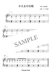 輪唱「蛙の合唱」伴奏付き楽譜です。4声の輪唱ができます。コードネーム付き、PDF1ページです。