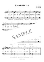 阿部直美作詞/作曲 手遊び歌 「ゆびさんはくしゅ」弾き歌い楽譜です。指で拍手したり、頭やお腹でパンパンしたり遊びます。お遊び方メモ、コードネーム付きPDF1ページです。