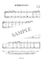 峯陽作詞/作曲 「ふうせんツンツン」弾き歌い楽譜です。風船を落とさないようにツンツンしながら歌いましょう。個人、グループで競争しても楽しいです。遊び方メモ、コードネーム付きPDF1ページです。