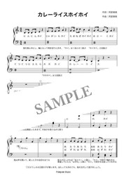 阿部直美作詞/作曲 「カレーライスホイホイ」遊び歌弾き歌い楽譜です。かごめのような形で遊び、鬼の後ろの人の声を聞いて、誰か当てる遊びです。遊び方メモ付き、PDF1ページです。