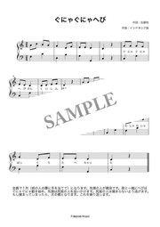 遊び歌「ぐにゃぐにゃへび」弾き歌い楽譜です。長い1列へびを作って歌いながら、先頭の人が尻尾の人を捕まえる遊びです。遊び方メモ付き、PDF1ページです。