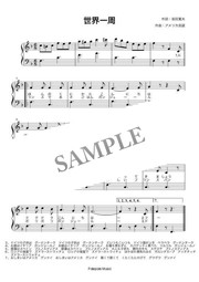 「世界一周」弾き歌い楽譜です。日本から始まってアメリカまで歌詞は7番あります。PDF1ページです。