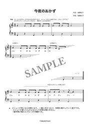 遊び歌「今夜のおかず」弾き歌い楽譜です。全体でメニューを3つ決めておき、2-3人のグループで始め、最後に同じメニューを言ったら仲間になるという遊びです。遊び方メモ付き、PDF1ページです。