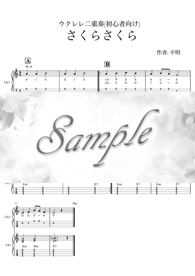 こちらは日本の童謡/歌曲 ”さくらさくら” のウクレレ二重奏の楽譜(タブ譜付)です。