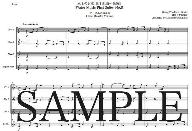 ヘンデル「水上の音楽 第1組曲~第5曲」オーボエ四重奏版 コンビニプリント対応