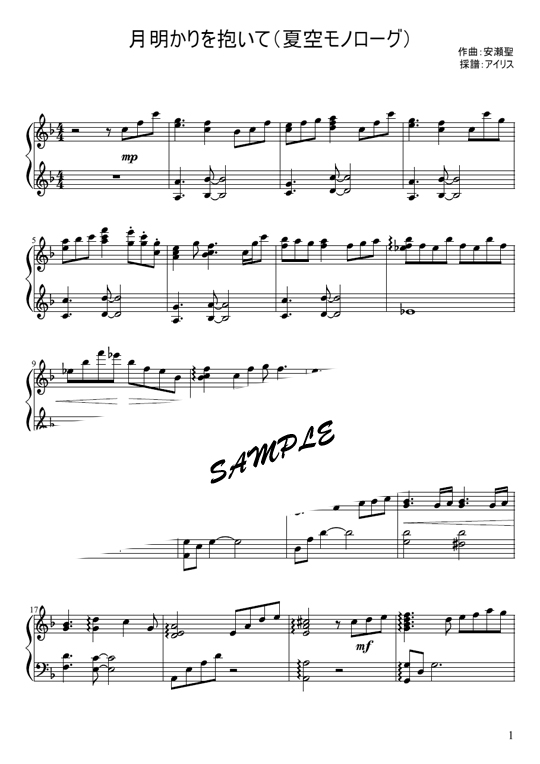 月明かりを抱いては夏空のモノローグで流れるBGMの楽譜です。