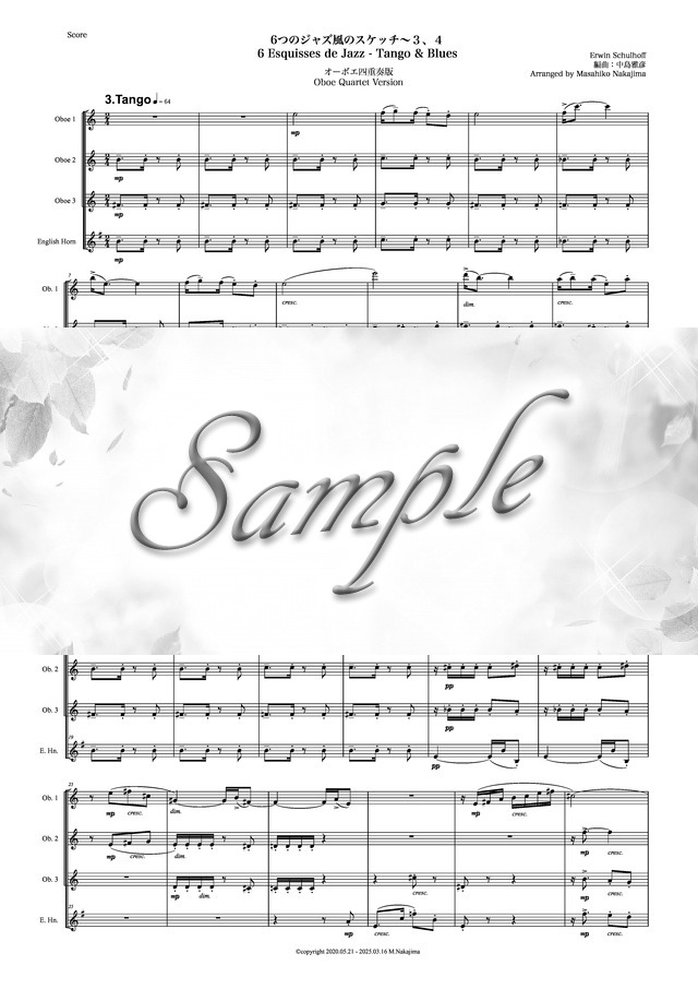 シュルホフ「6つのジャズ風のスケッチ~3、4」オーボエ四重奏版 コンビニプリント対応