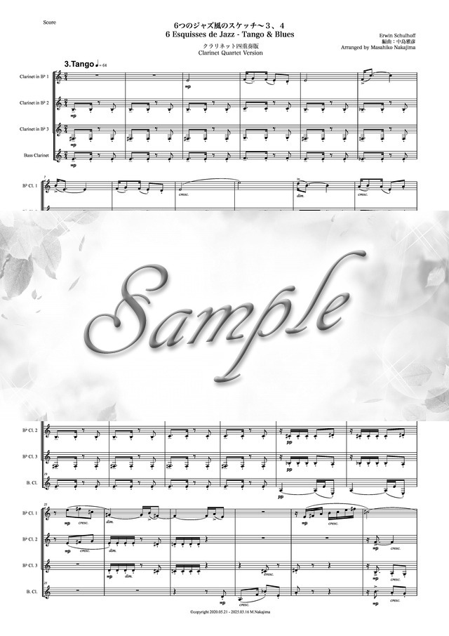 シュルホフ「6つのジャズ風のスケッチ~3、4」Newクラリネット四重奏版 コンビニプリント対応