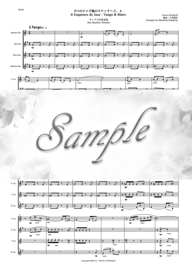 シュルホフ「6つのジャズ風のスケッチ~3、4」Newサックス四重奏版 コンビニプリント対応
