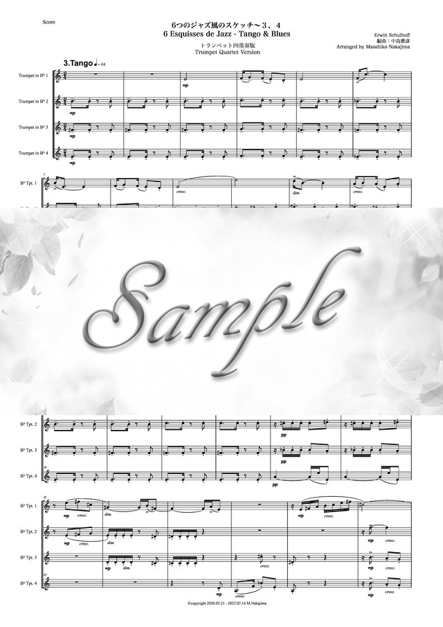 シュルホフ「6つのジャズ風のスケッチ~3、4」トランペット四重奏版 コンビニプリント対応