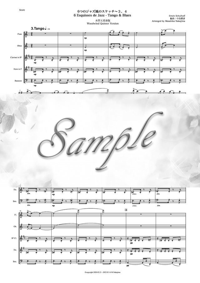 シュルホフ「6つのジャズ風のスケッチ~3、4」木管五重奏版 コンビニプリント対応