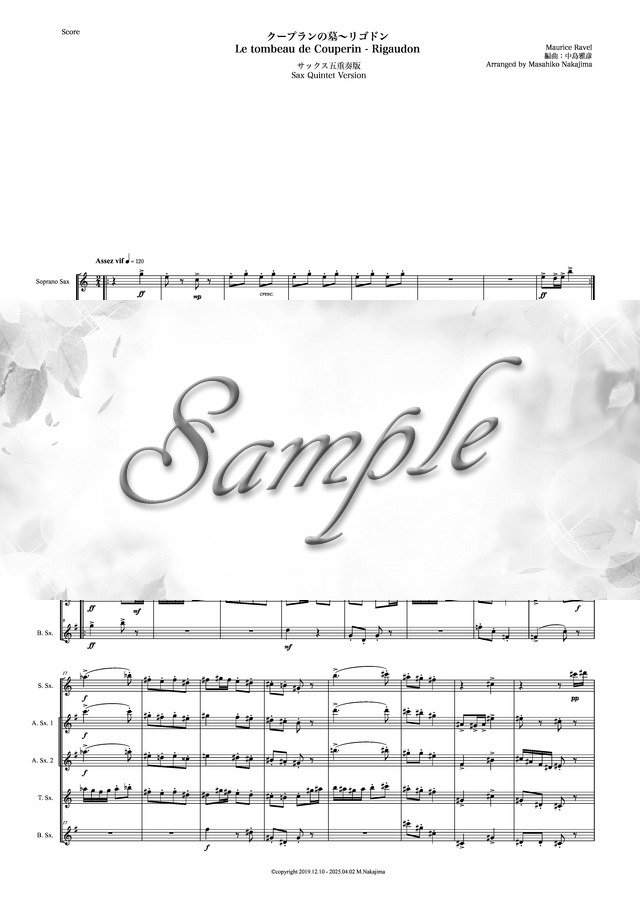 ラヴェル「クープランの墓~リゴドン」Newサックス五重奏版 コンビニプリント対応
