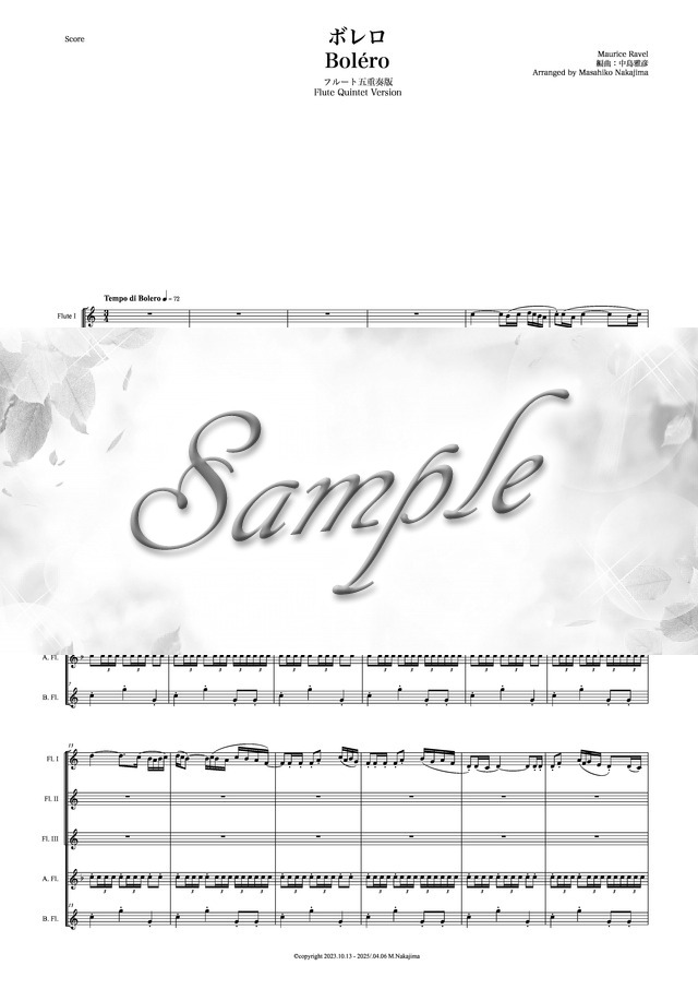 ラヴェル「ボレロ」フルート五重奏版 コンビニプリント対応