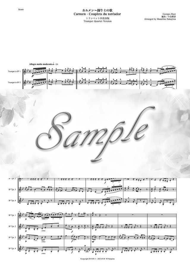 ビゼー「カルメン~闘牛士の歌」トランペット四重奏版 コンビニプリント対応