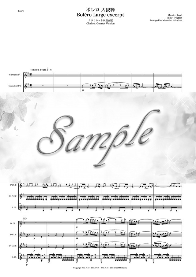 ラヴェル「ボレロ大抜粋」クラリネット四重奏版 コンビニプリント対応