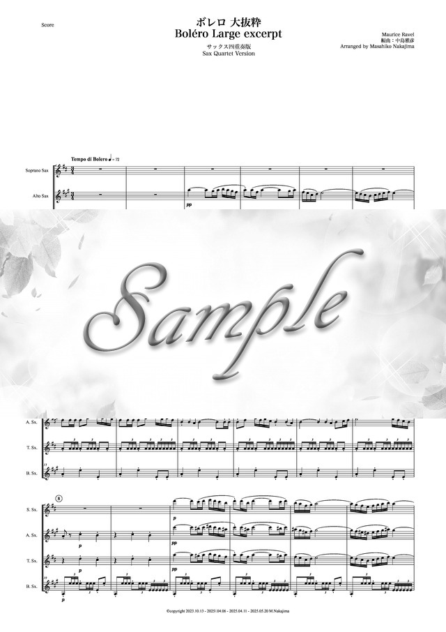 ラヴェル「ボレロ大抜粋」サックス四重奏版 コンビニプリント対応