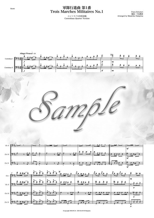 シューベルト「軍隊行進曲第1番」コントラバス四重奏版 コンビニプリント対応