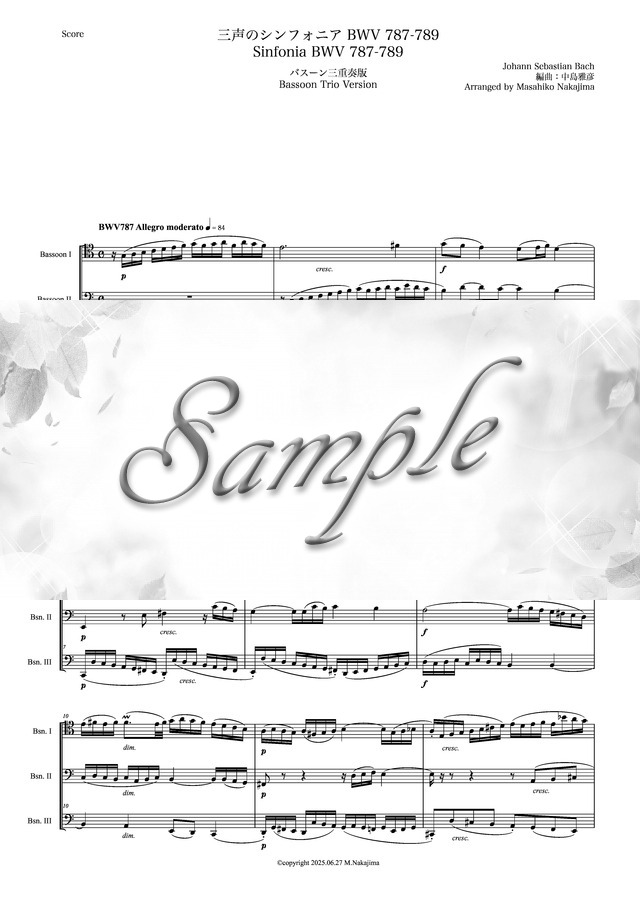 バッハ「三声のシンフォニアBWV787-789」バスーン三重奏版 コンビニプリント対応