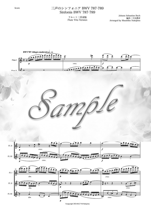 バッハ「三声のシンフォニアBWV787-789」フルート三重奏版 コンビニプリント対応
