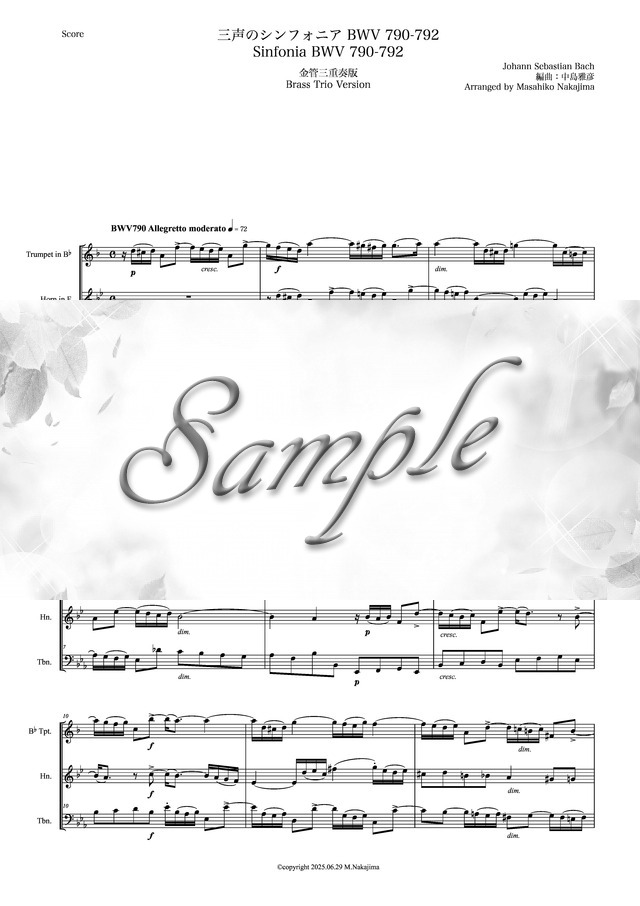 バッハ「三声のシンフォニアBWV790-792」金管三重奏版 コンビニプリント対応