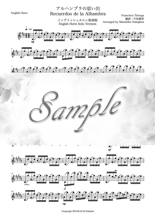 タレガ「アルハンブラの思い出」イングリッシュホルン独奏版 コンビニプリント対応