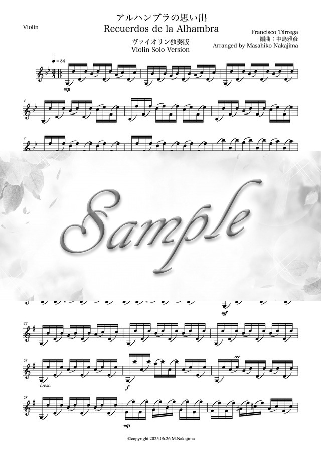 タレガ「アルハンブラの思い出」ヴァイオリン独奏版 コンビニプリント対応