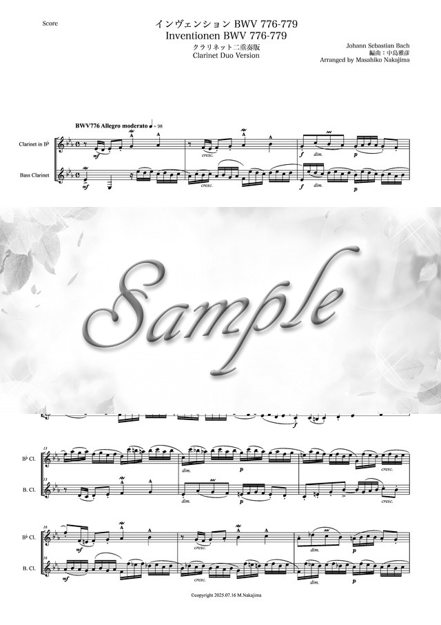 バッハ「インヴェンションBWV776-779」クラリネット二重奏版 コンビニプリント対応