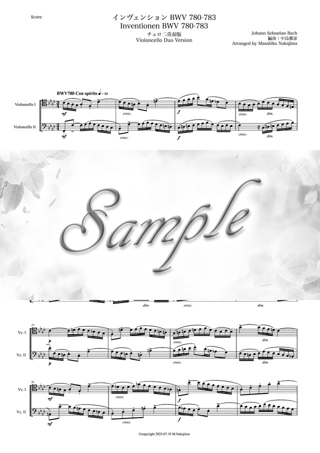 バッハ「インヴェンションBWV780-783」チェロ二重奏版 コンビニプリント対応