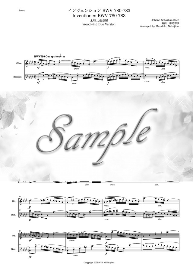 バッハ「インヴェンションBWV780-783」木管二重奏版 コンビニプリント対応