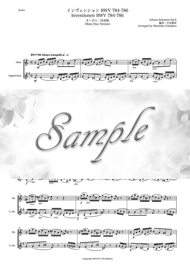 バッハ「インヴェンションBWV784-786」オーボエ二重奏版 コンビニプリント対応