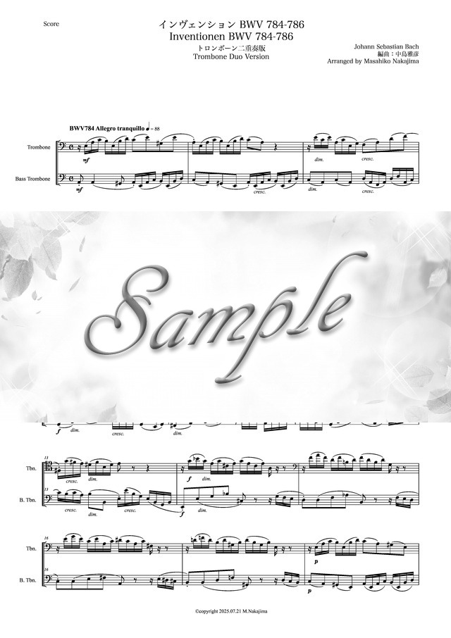 バッハ「インヴェンションBWV784-786」トロンボーン二重奏版 コンビニプリント対応