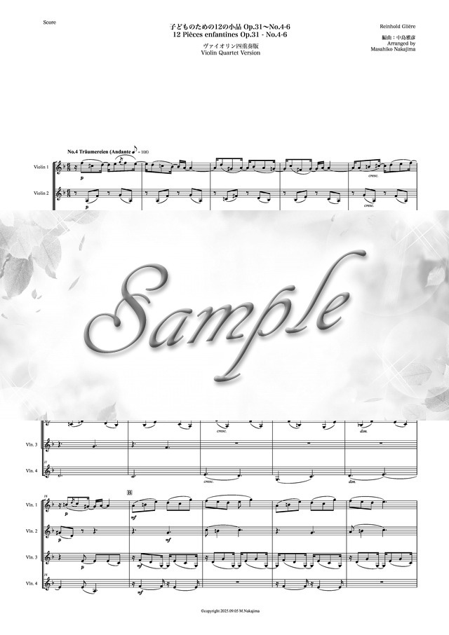 グリエール「子どものための12の小品~No.4-6」ヴァイオリン四重奏版 コンビニプリント対応