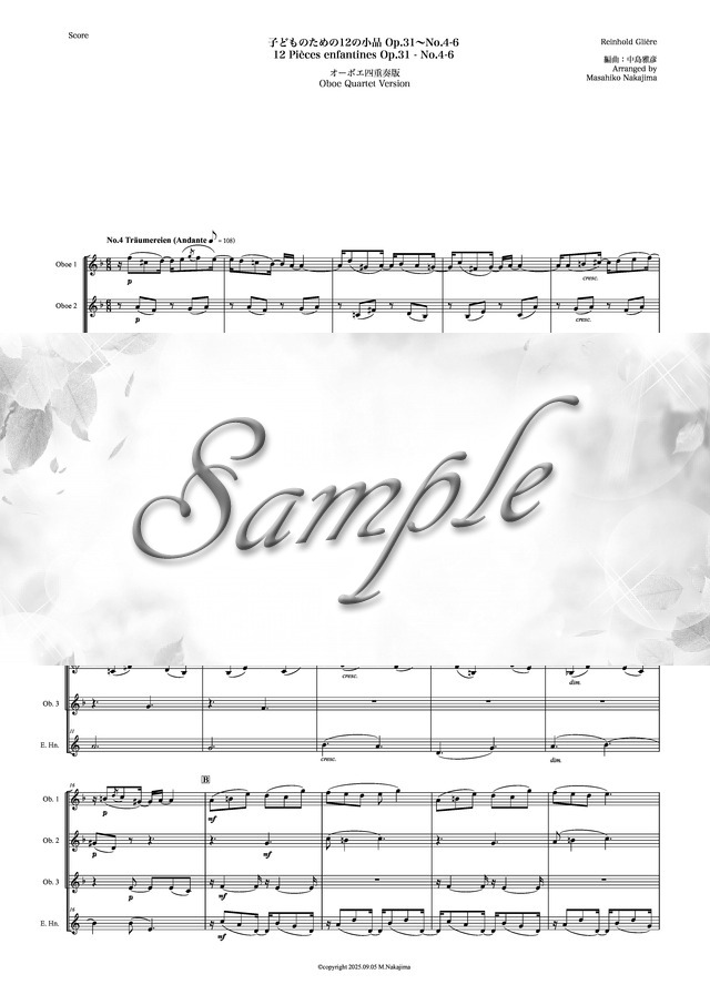 グリエール「子どものための12の小品~No.4-6」オーボエ四重奏版 コンビニプリント対応