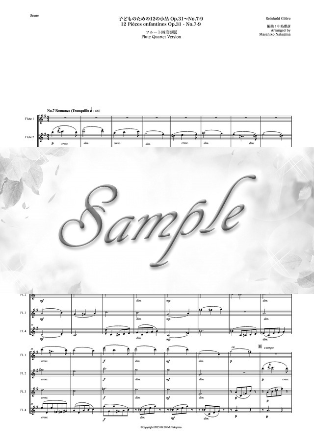 グリエール「子どものための12の小品~No.7-9」フルート四重奏版 コンビニプリント対応