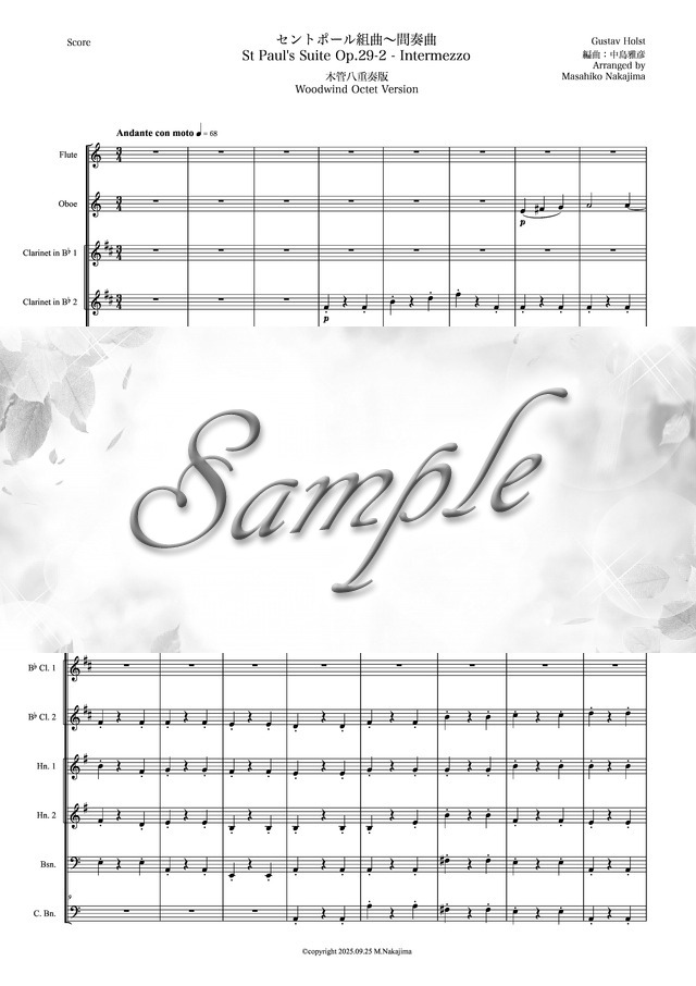 ホルスト「セントポール組曲~間奏曲」木管八重奏版 コンビニプリント対応