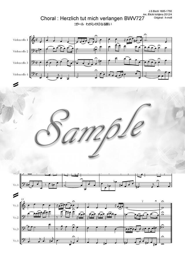 - コラール わが心の切なる願い BWV727 のチェロ四重奏版です。スコアとパート譜のセットです(スコアとパート譜のいずれでも演奏可能です)。
