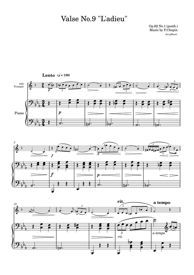 「告別のワルツ」op.69 No.1 トランペット&ピアノ コンビニプリント対応