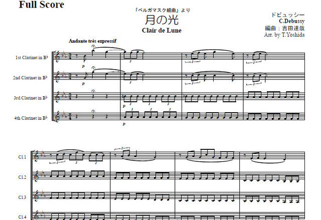 ■♪フランスの印象派の作曲家C・ドビュッシーの名曲『月の光』を、クラリネット4重奏で演奏しましょう。静かな夜に窓から差し込む月の光を想像し、しめやかに演奏しましょう。B♭管4人集まれば演奏できます、お試しください。この曲は単独で演奏されることも多いようですが、ピアノ曲「ベルガマスク組曲」の第2曲です。なお、今回の楽譜は、WW-0233月の光(木管4重奏)をクラリネット4重奏にアレンジしなおしたものです。