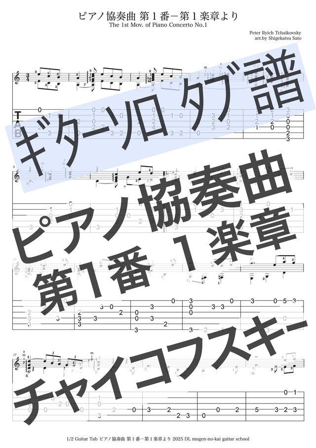 ピアノ協奏曲第1番 第1楽章より / チャイコフスキー ギターソロ タブ譜と楽譜 コンビニプリント対応