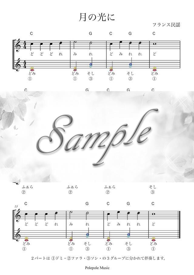 - フランス民謡「月の光に」メロディーとハンドベル(2つの和音)のアンサンブルです。1パートはメロディー楽器、2パートはハンドベル2つの和音でできており、数字も振ってあるのでその場ですぐにアンサンブルができます。(色音符ふりがな付き)PDF1ページです。