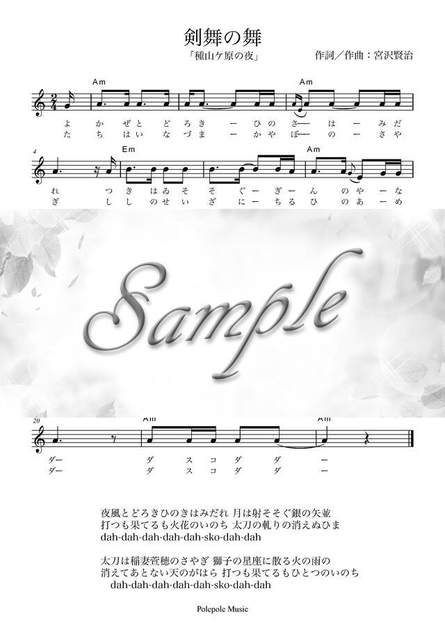- 宮澤賢治作詞/作曲「種山ケ原の夜」より「剣舞の舞」メロディー譜(歌詞付き)です。2番の歌詞、コードネーム付き、PDF1ページです。