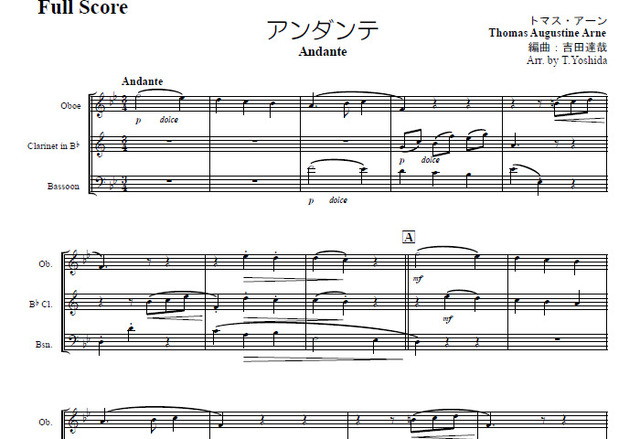 ■♪作曲者のトマス・アーン(Thomas Augustine Arne,1710-1778)は18世紀イギリスの作曲家で、多数のオペラや歌曲を作曲しています。この曲「アンダンテ」は出自不詳ですが、初心者向けのピアノ練習曲のようです。木管3重奏向けのアレンジです。それぞれの動きをお互いによく聞きあって、美しいハーモニーを作りましょう。ところどころに細かい動きの音符が出てきますので、よく合わせましょう。
