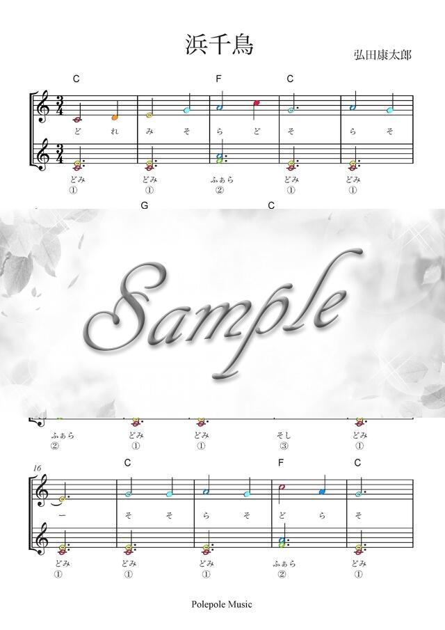 - 弘田康太郎作曲「浜千鳥」ハンドベル簡単アンサンブル楽譜です。2パートでできています。1パートはメロディーでm他のエロディー楽器でも演奏できます。2パートは3つの和音からできており、数字も振ってありますので、その場ですぐに演奏できます。色音符、コードネーム付き、PDF2ページです。