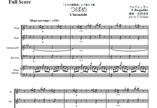 ■♪ピアノを習ったことがある人なら、どこかで弾いたことがある「25の練習曲」。この「つばめ」は、24曲目にあたります。つばめが素早くクルリと宙返りして飛び回るのを描写した曲で、この曲集の中でも難易度の高い曲です。FL.の装飾音符は原曲にはありませんが、スピード感を表現するためにつけてみました。ピアノは必須ではありませんが、可能であれば加えてみると面白いかもしれません。