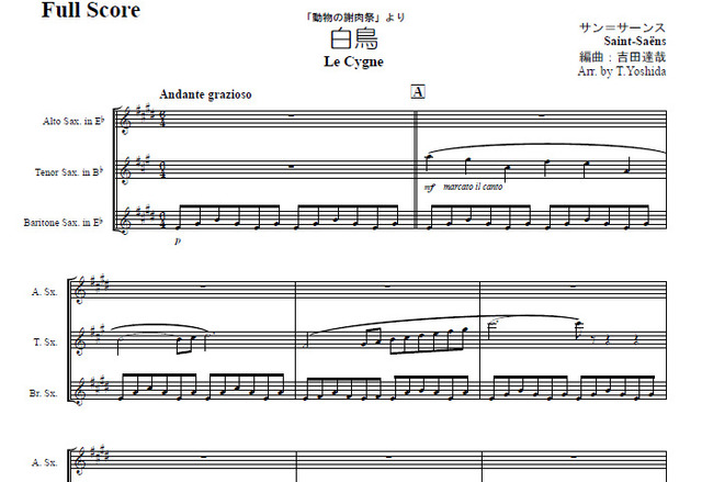 ■♪湖の上を優雅に泳ぐ白鳥を描写した曲「白鳥」は、サン・サーンスの代表作といっても過言でないでしょう。この曲は、組曲≪動物の謝肉祭≫の13曲目にあたり、まさに組曲を締めくくる曲ですね。今回のアレンジは、サクソフォン3重奏。原曲と同じ調なのでサックスでは♯が多くなりますが、スローテンポな曲なので、何とかなるでしょう。